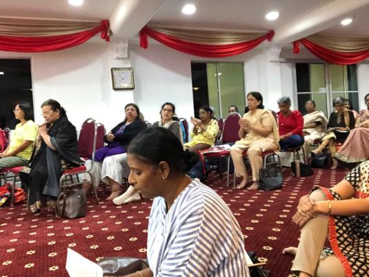 Day 12 of Geeta Jayanti – Devotees listening to Dr Sarinder Kumari sharing with us stories from Gurudev.